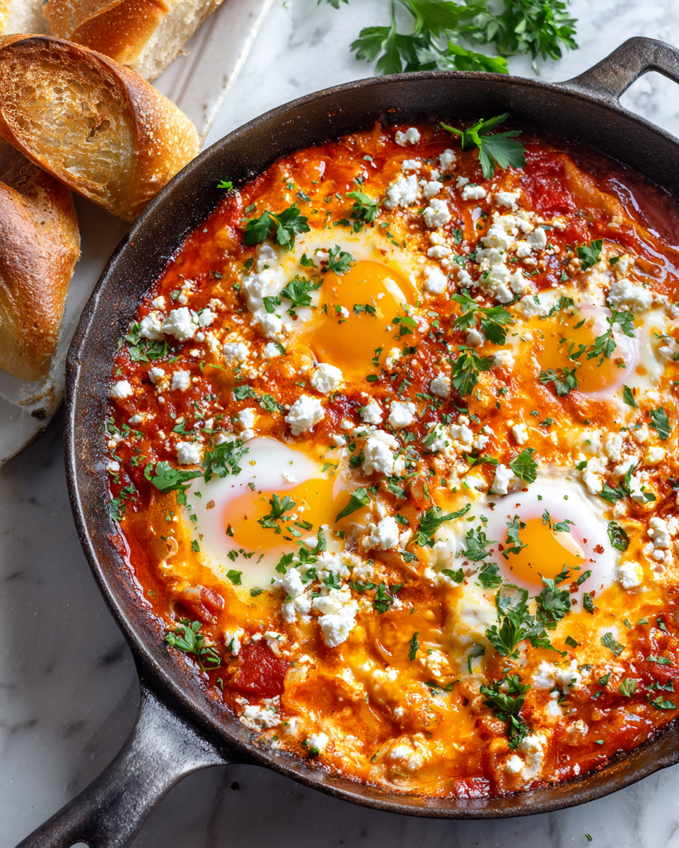 This Shakshuka recipe features poached eggs in a spiced tomato sauce, perfect for a cozy gathering.