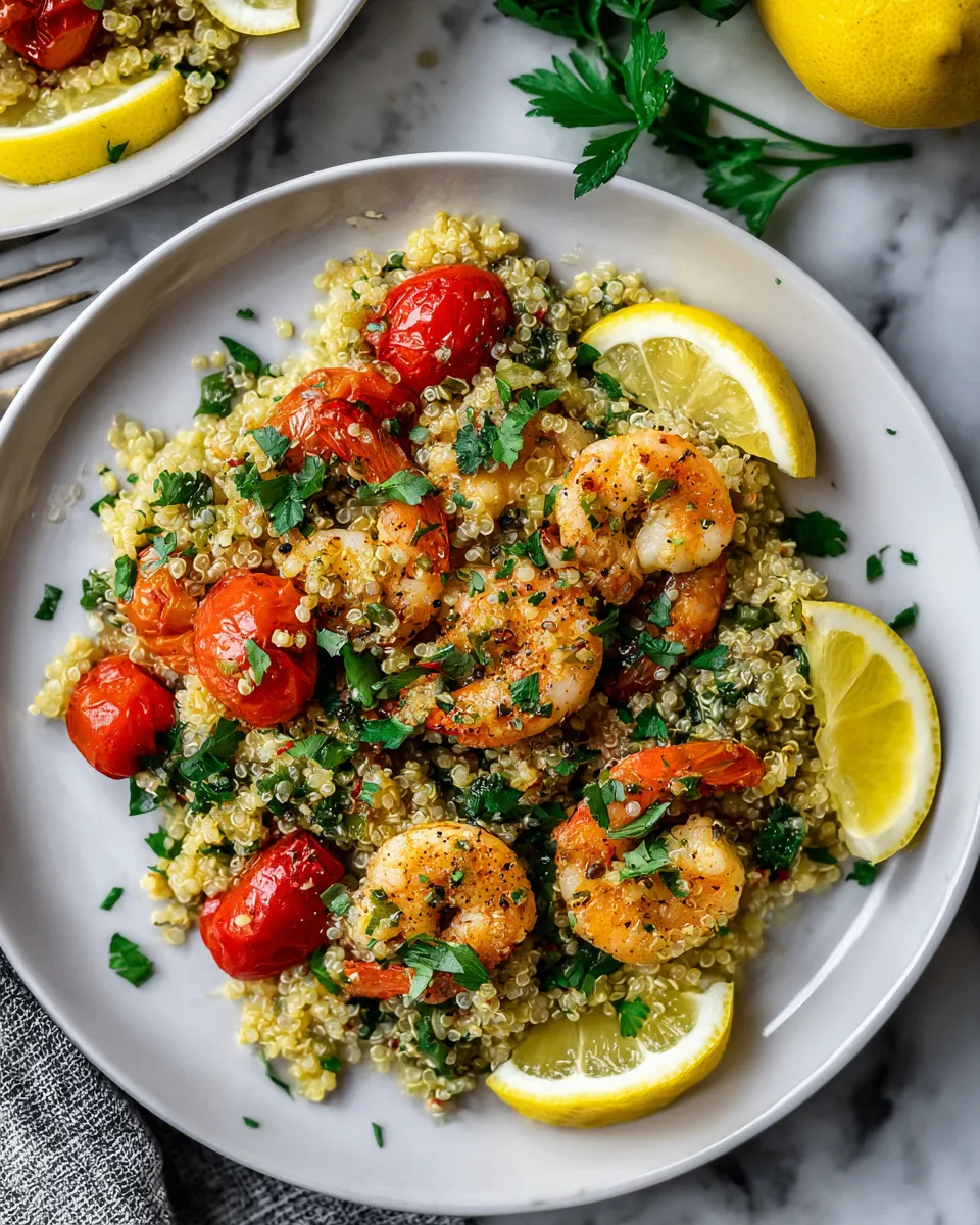 Once the shrimp are perfectly cooked, stir in the halved cherry tomatoes, letting them heat through for a minute or so. Then, add the quinoa, lemon zest, and lemon juice to the skillet. Toss everything together with the remaining olive oil and add salt and pepper to taste. The combination of flavors is lively, with the shrimp and tomatoes making a lovely contrast against the earthy quinoa.