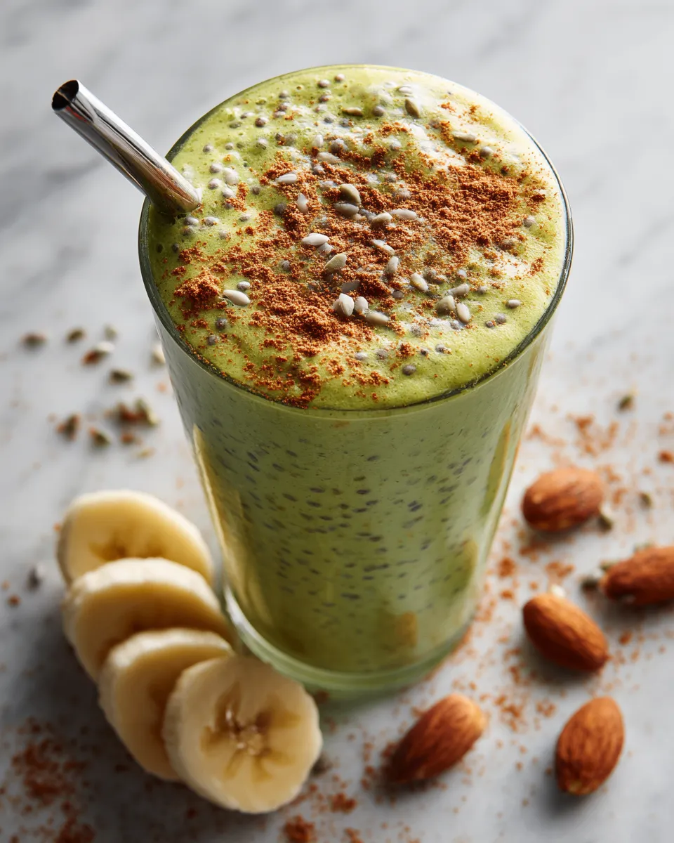 This nutritious breakfast shake combines fresh spinach, banana, Greek yogurt, almond milk, almond butter, and chia seeds for a delightful morning boost.