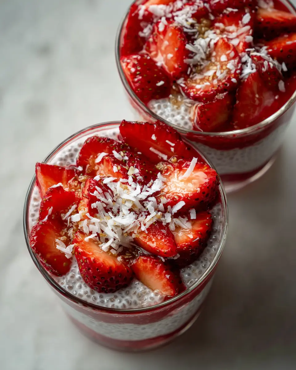 Layer the chia seed pudding in glass cups with the sliced strawberries for a beautiful presentation. Top with additional strawberries, shredded coconut, or granola for added texture and flavor.