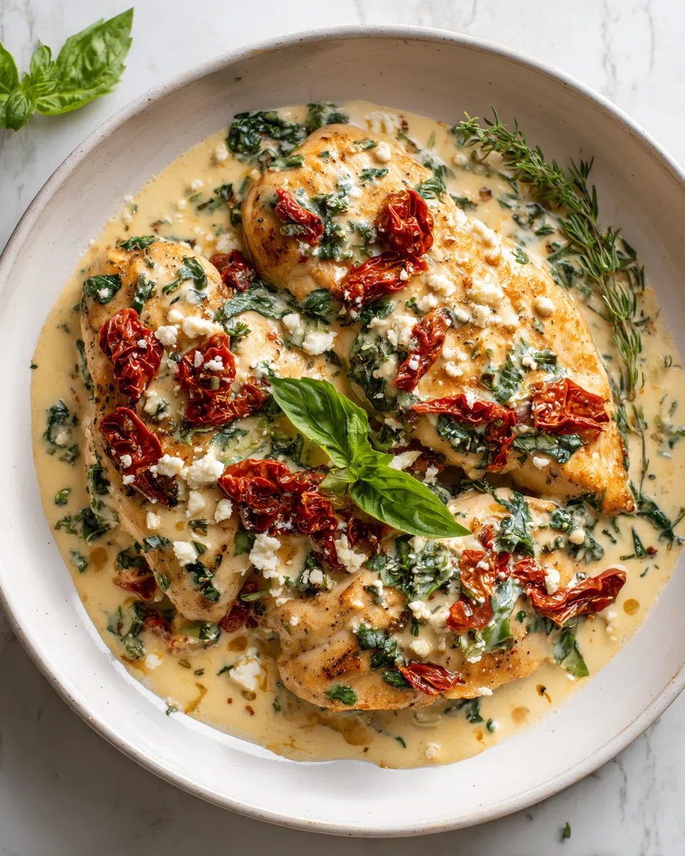 Season and sear chicken breasts, then simmer with garlic, sun-dried tomatoes, cream, feta, and basil for a rich Tuscan-inspired dish.